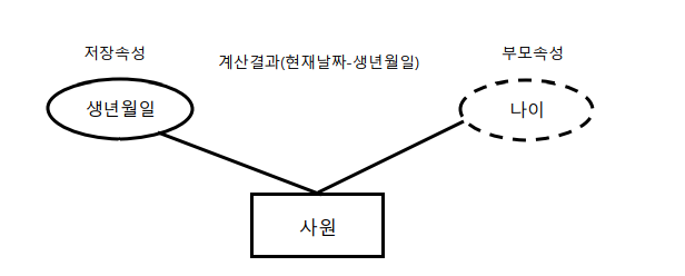 - 유도된 애트리뷰트(Derived Attribute) : 실제 값이 저장되어 있는 것이 아니라 저장된 값으로부터 계산해서 얻은 결과 값을 사용하는 애트리뷰트를 말한다.