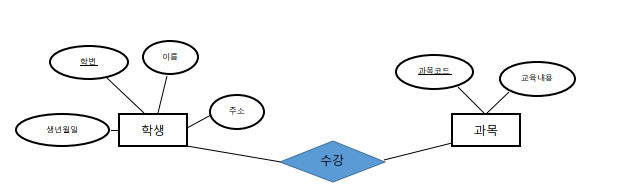 - 엔티티(Entity) : 정보가 저장될 수 있는 사람, 장소, 사물, 사건 등 독립적인 존재. 즉, 테이블(학생, 과목, 수강, 사원, 부서)