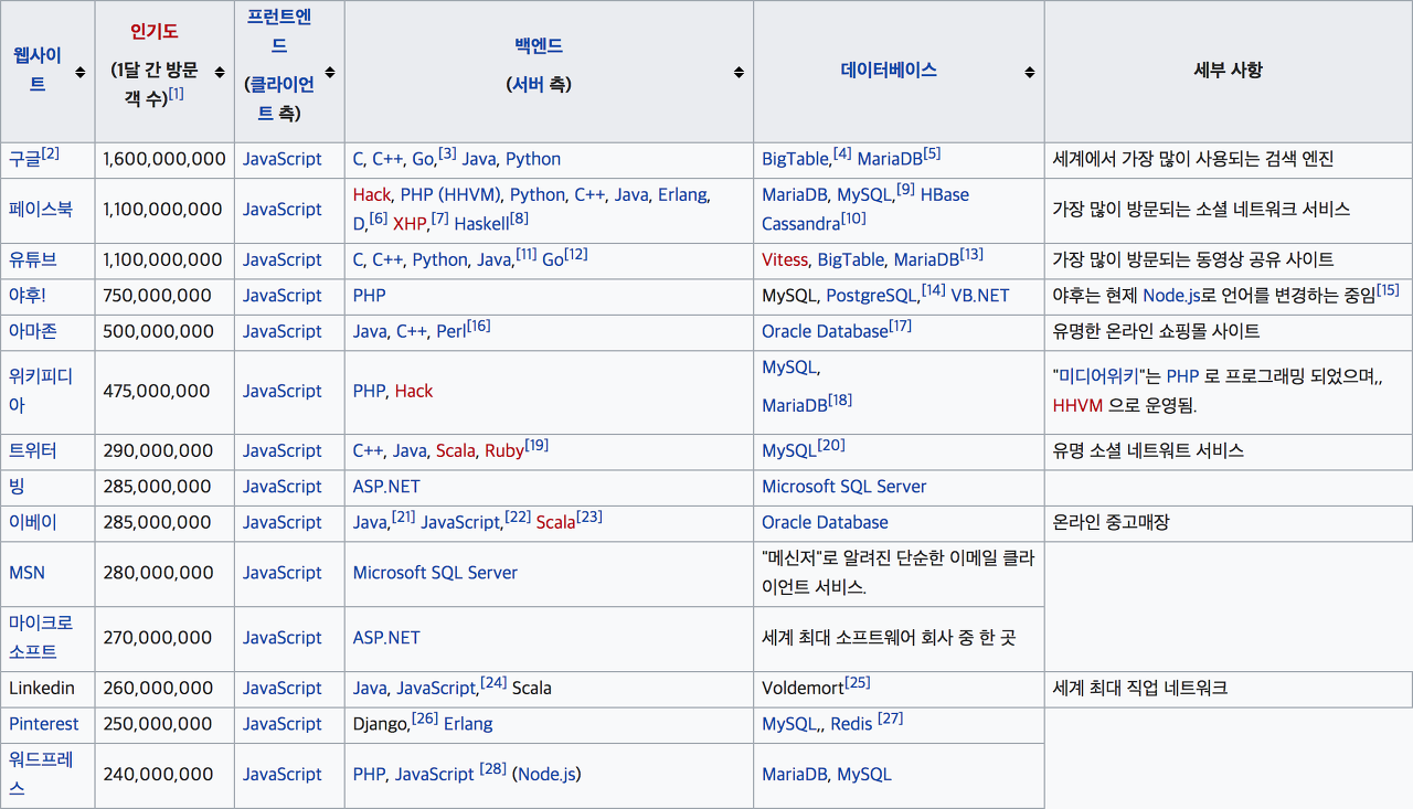 - 웹 백엔드 (서버) => Python, Ruby, JavaScript, Java, Go, C, C++, PHP 등